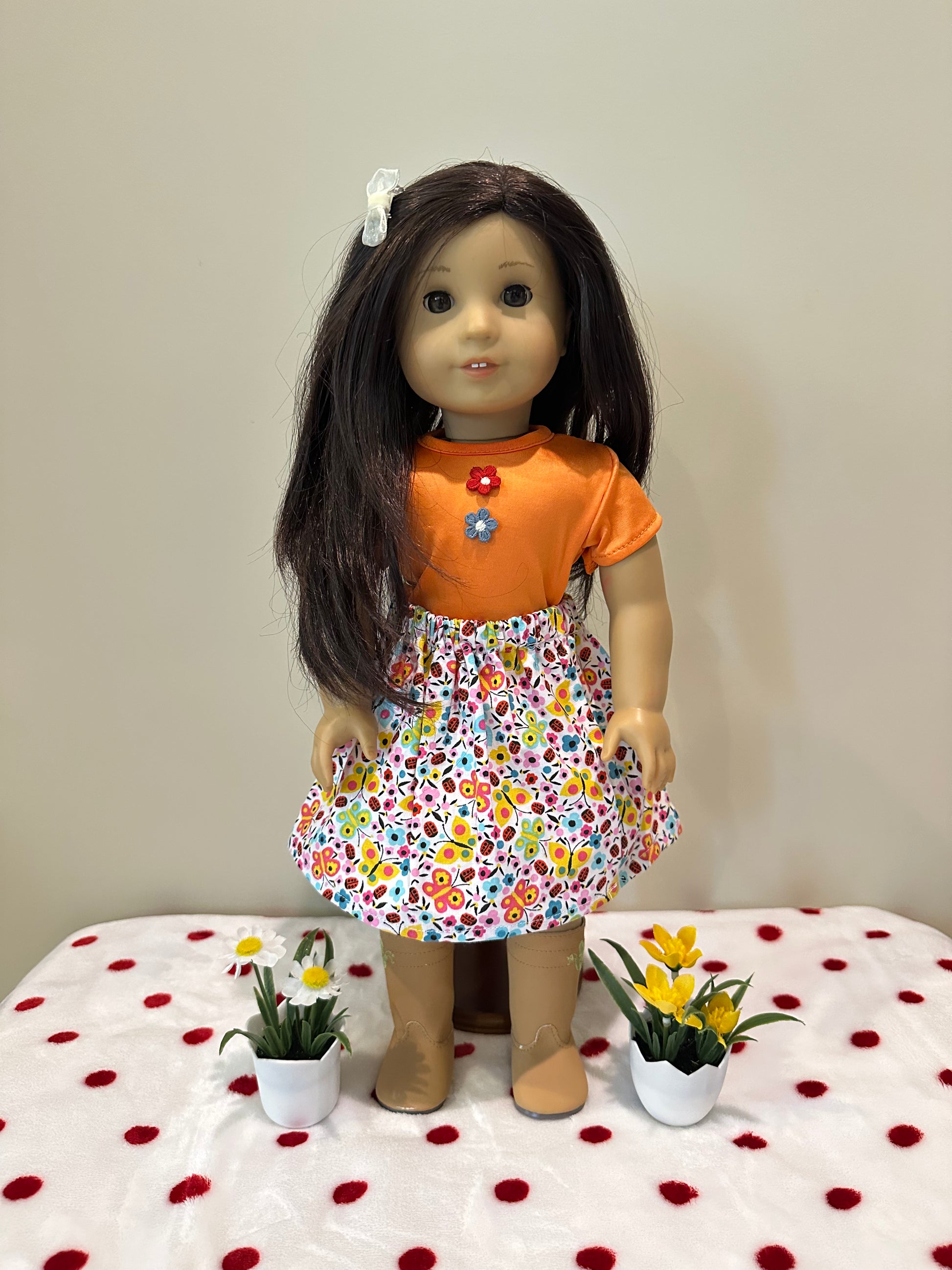 Bright and full of life, this set pairs an orange top with colorful floral appliqués and a lively skirt covered in butterflies and flowers. A cheerful choice for sunny days and outdoor play.