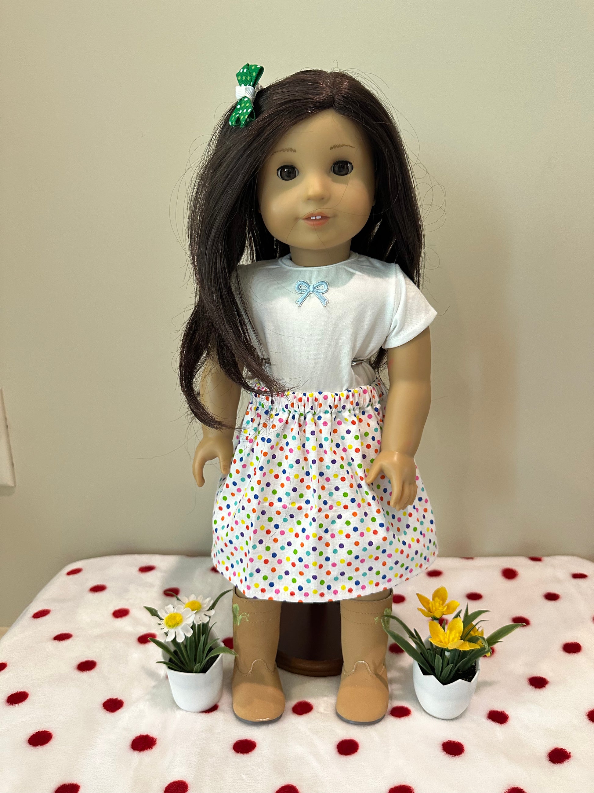Fun and festive, this look pairs a white top with a blue bow and a colorful confetti polka-dot skirt. A celebration-ready favorite!