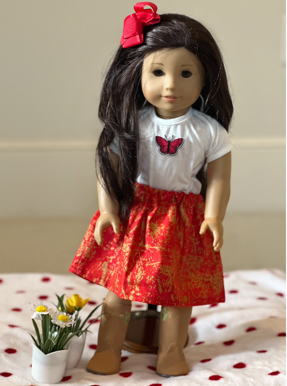This set brings a bold burst of color to your doll’s wardrobe. The crisp white top features a sweet embroidered butterfly, perfectly paired with a fiery red skirt patterned with golden floral accents. Designed to fit 18-inch dolls, this outfit will ensure your doll stands out in style.