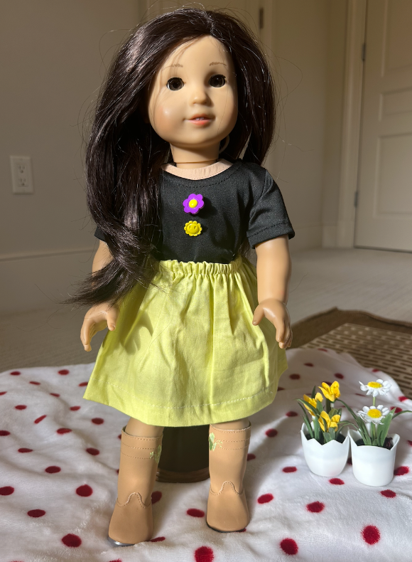 The Lime Blossom Set brings a sunny twist to any 18-inch doll’s wardrobe. The outfit pairs a soft black top adorned with floral buttons and a light, citrus-green skirt that adds a fresh pop of color. This two-piece ensemble is perfect for garden playdates or summer strolls!