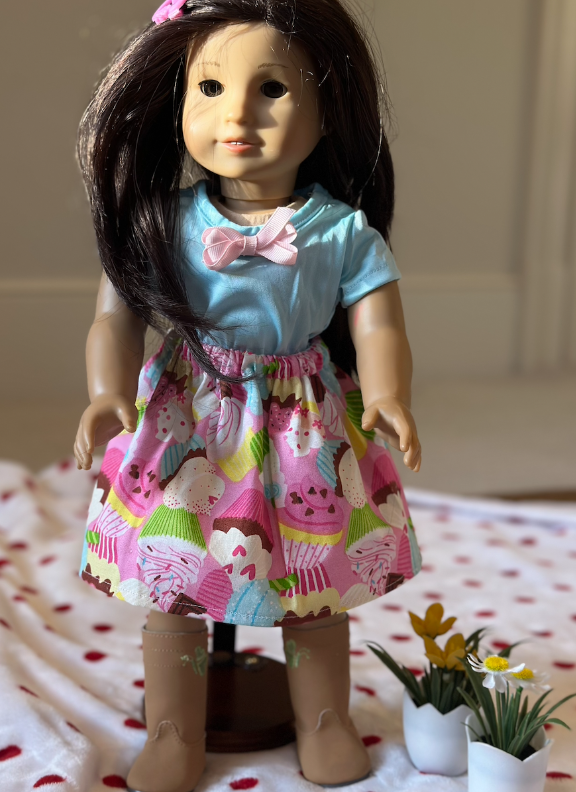 Whipped up with love, this delightful two-piece outfit is a sugar-sweet addition to any 18-inch doll’s wardrobe. The soft pastel blue top is accented with a light pink bow. The real showstopper is the vibrant skirt, with a playful cupcake print —perfect for dessert-themed adventures or cheerful dress-up days. This will surely be the cherry on top of your doll's wardrope!